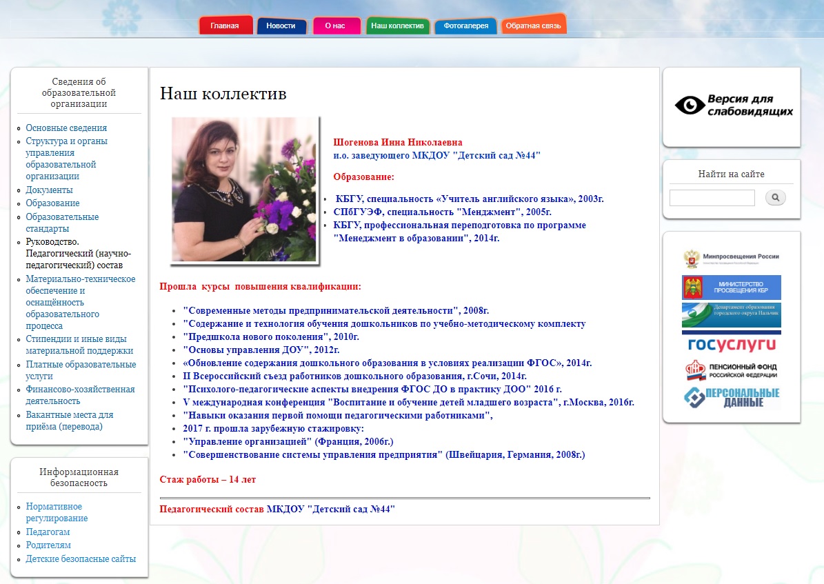 Мы рады приветствовать Вас на нашем новом портале МКДОУ "Детский сад №44" г.о.Нальчик. Это был для нас серьезный шаг, ведь мир меняется и мы меняемся вместе с ним. Мы хотим развиваться и открыто сотрудничать. Делиться удивительными событиями, которые происходят в нашем учреждении, быть открытыми для сотрудничества и прислушиваться к нашим родителям. Именно поэтому мы решили создать новую, современную, открытую платформу. У нас много идей, и со временем, мы постараемся их реализовать.